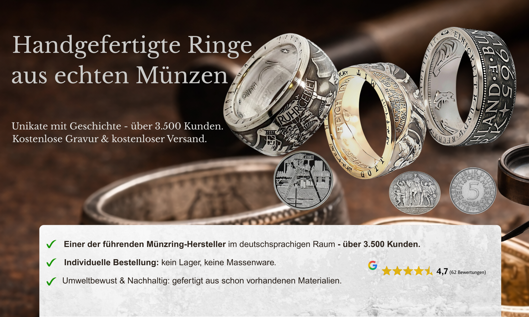 Willkommen in unserer kreativen Welt, in der wir aus alten Münzen einzigartige Schmuckstücke fertigen. Das Design und die Herstellung von Schmuck, insbesondere Ringen, sind unsere Leidenschaft, die wir mit Hingabe zum Beruf gemacht haben.