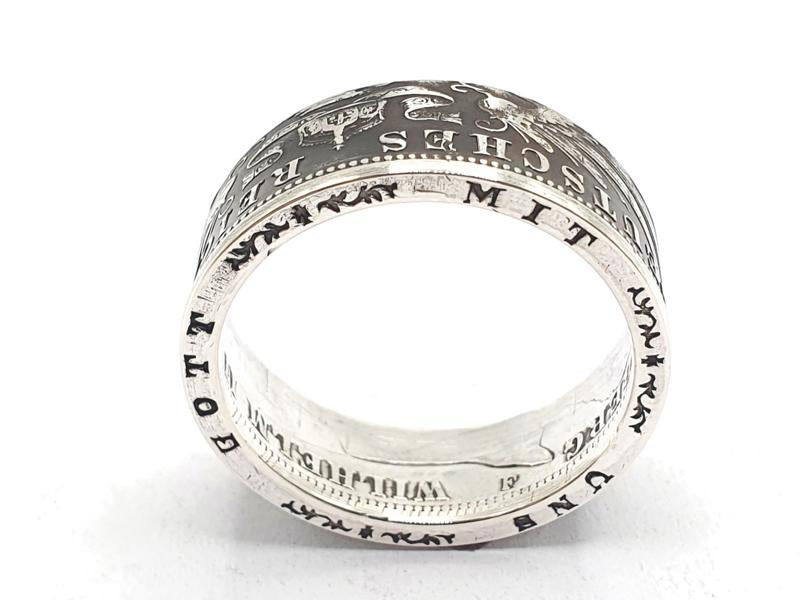 Dieser handgefertigte Silberring aus einer originalen 3 Mark Silbermünze des deutschen Kaiserreichs verkörpert die imperiale Pracht der wilhelminischen Ära. Gefertigt aus hochwertigem 900er Silber, trägt jeder Ring die Majestät und Würde des deutschen Kaiserreichs (1871-1918).